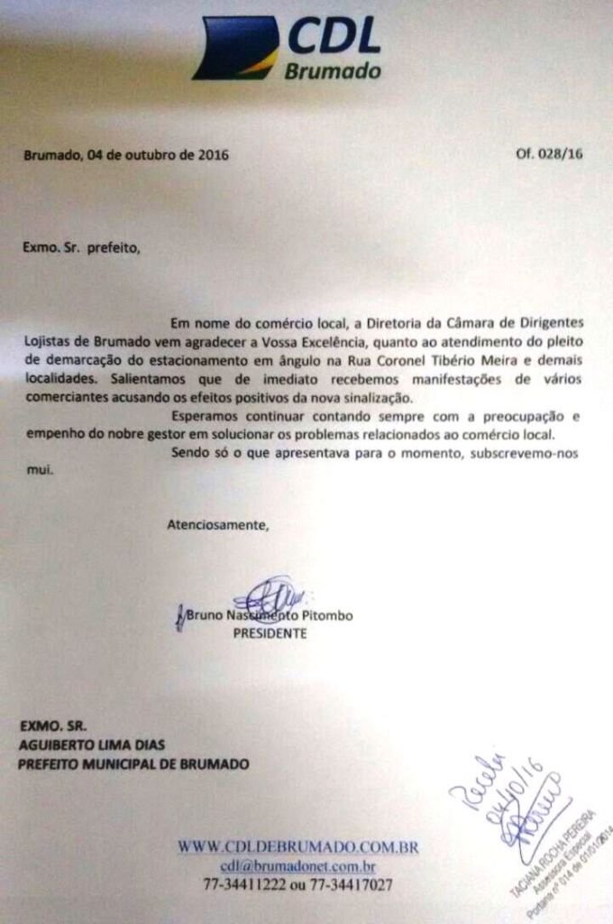 Como já se sabe, estacionar veículos no centro de Brumado não tem sido tarefa fácil há muito tempo. Sendo assim, a Câmara de Dirigentes Lojistas de Brumado (CDL), representando os comerciantes, solicitou à prefeitura que demarcasse estacionamentos em ângulos na rua Coronel Tibério Meira e demais ruas com grande movimento no centro da cidade, desse modo, ficou mais fácil para que todos possam, no cotidiano, estacionarem os seus carros com maior facilidade. Sendo assim, diante dos benefícios diversos e satisfação das pessoas diante da medida, a CDL agradece imensamente à prefeitura municipal por ter atendido ao seu pedido e enfatiza que ações assim contribuem muito para a organização e desenvolvimento da cidade.