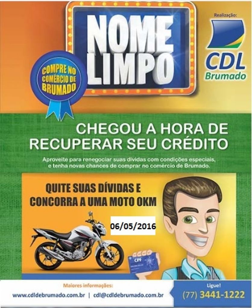 Devido ao sucesso da campanha Feirão do Nome Limpo, a Câmara de Dirigentes Lojistas de Brumado decidiu prorrogar o prazo da campanha até o dia 10 de maio de 2016. Todas as pessoas que possuem débitos em atraso no comércio da cidade ou seus nomes em SPC/SERASA devem aproveitar esta oportunidade, pois, serão diversas vantagens como: