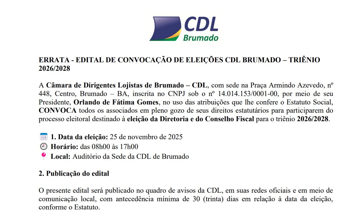 ERRATA - EDITAL DE CONVOCAÇÃO DE ELEIÇÕES CDL BRUMADO – TRIÊNIO 2026/2028